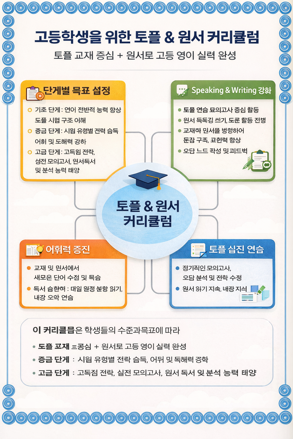 이 단계에서는 고등 영어와 입시형 학습을 대비하여 비판적 분석과 논리적 서술 능력을 강화합니다.